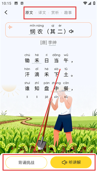 4、点击目标课文进入详情页,能查看原文、译文等内容,还可点击【背诵挑战】开启背诵练习啦。