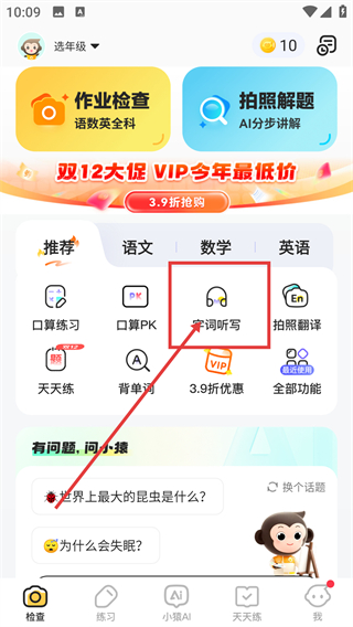1、在练习页面点击【字词听写】选项,就能进入对应学段的字词听写选择界面,开启听写练习啦。