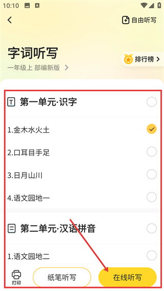 2、进入字词听写页面后,选择目标单元(比如第一单元·识字),再点【在线听写】就能进入听写范围设置页哦。