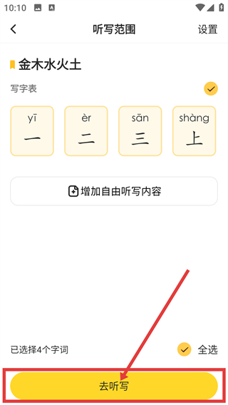 3、在听写范围页确认要练习的字词后,点击底部的【去听写】按钮,就能进入实际的听写练习环节啦。
