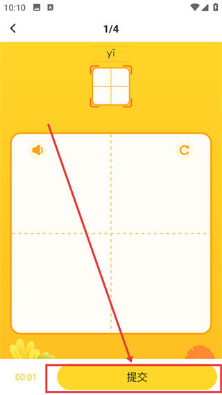4、进入听写练习界面后,完成当前字词的书写任务,就能点击【提交】按钮确认答案,继续下一个字词啦。