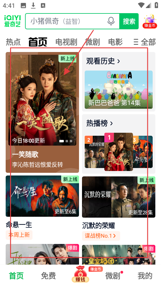 1、首页有很多精彩内容,像【一笑随歌】等新上线剧集,还有热播榜,快选一部感兴趣的开始观看吧。