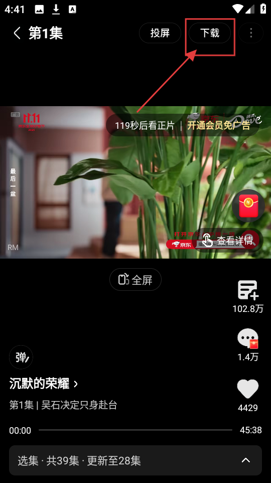 2、进入剧集播放页后,若想下载剧集,就点击右上角【下载】,进入下载选择页面。
