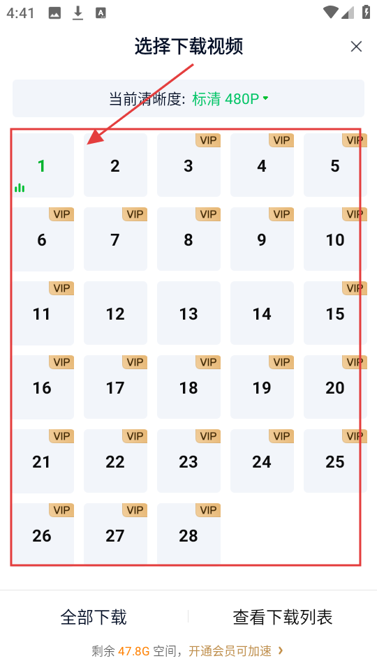 3、进入下载选择页面,能看到各集数选项,选择想要下载的集数,就能开始下载啦。
