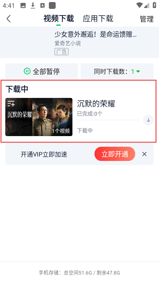 4、选好集数后,就会进入下载管理页面,能看到下载进度,等待下载完成即可。