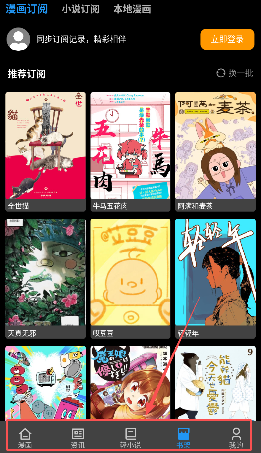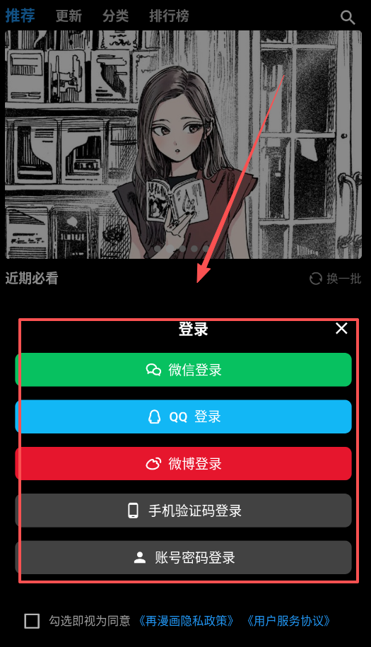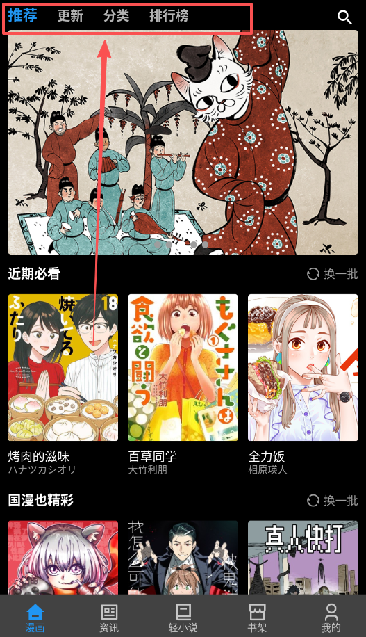 1、首先打开再漫画app,在首页可以看到推荐、更新、分类和排行榜四个主要板块,可以点击换一批按钮刷新推荐列表。