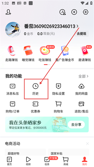 2、进入个人中心后,点击【历史】选项,就能进入历史记录页面,查看之前浏览过的内容哦。