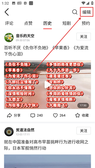 3、在历史页面点击右上角的【编辑】按钮,就能进入历史记录的编辑模式,准备管理这些记录啦。