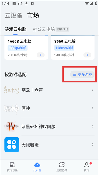 2、进入云设备市场后点击【更多游戏】按钮,就能跳转到更多游戏的列表页面,选择想运行的游戏哦。