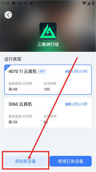 4、进入游戏配置页面后点击【添加新设备】按钮,就能为该游戏配置对应的云设备,开启云端运行啦。