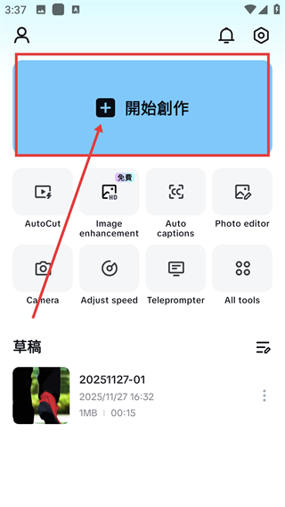 1、在应用首页,点【開始創作】按钮能进入创作编辑页,选择素材开始制作视频啦。