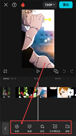 4、切换到音频相关工具栏,点【音樂】选项,可给视频添加背景音乐,丰富作品的听觉效果哦。