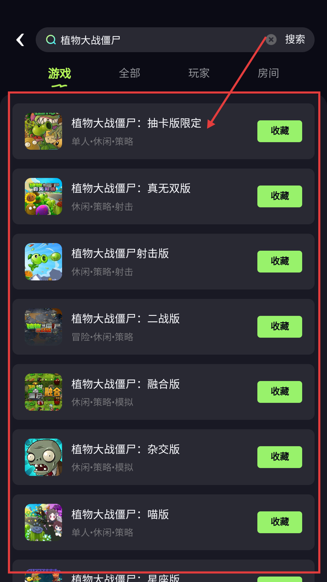 3、在搜索结果页面,选择《植物大战僵尸:抽卡版限定》等游戏,可进入游戏详情页面,准备开始游戏啦。