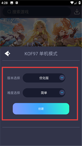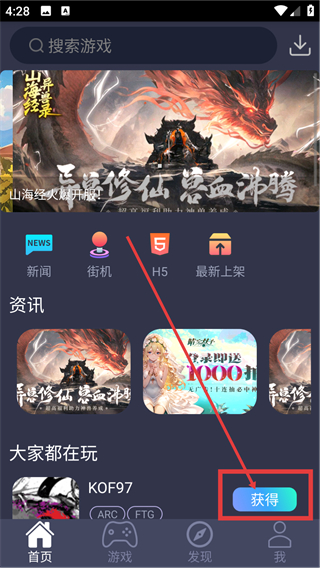 1、在首页找到想玩的游戏,像【KOF97】,点它旁边的【获得】按钮,就能进入游戏的启动选项页啦。