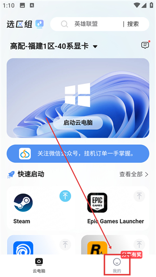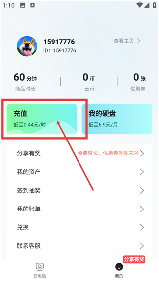 1、在云电脑主界面点右下角的【我的】按钮,就能进入个人中心页面,查看账号相关信息啦。