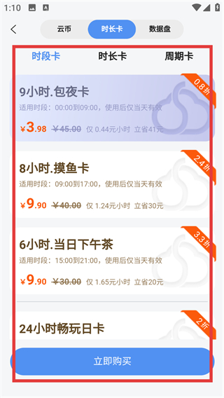 4、在时长卡页面能看到多种时段卡,像【9小时.包夜卡】,选好后点立即购买就能完成支付啦。
