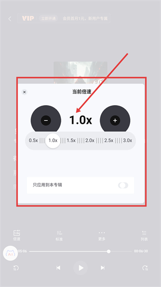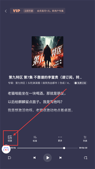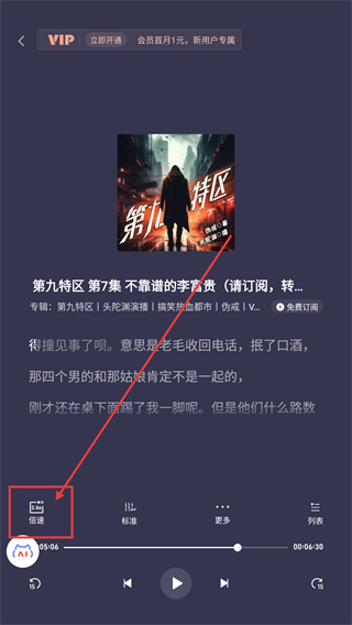 2、进入播放详情页后,点击左下角的【倍速】按钮,可打开倍速调节面板,调整音频播放速度哦。