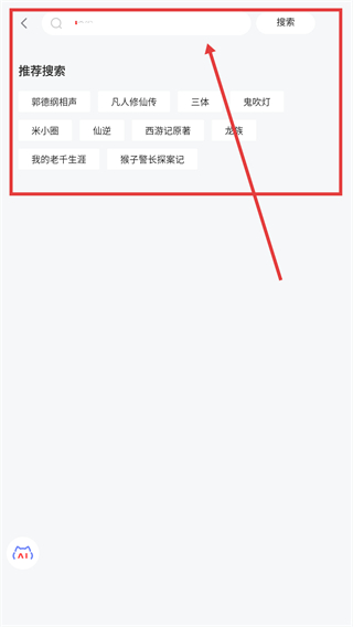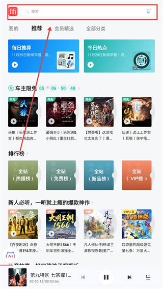 1、在应用的推荐页,点顶部搜索框能进入搜索界面,后续可搜喜欢的音频内容啦。