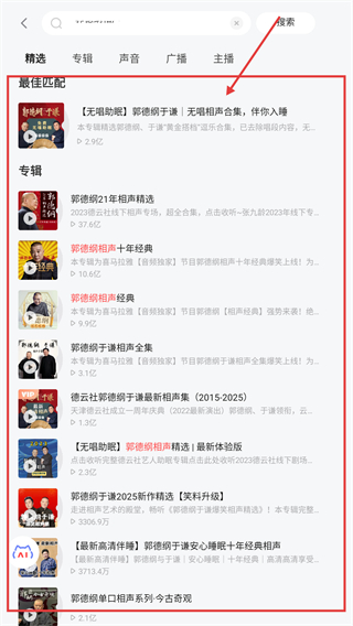 3、搜索结果页会显示相关专辑,比如【郭德纲21年相声精选】,选对应的专辑就能进入详情页啦。