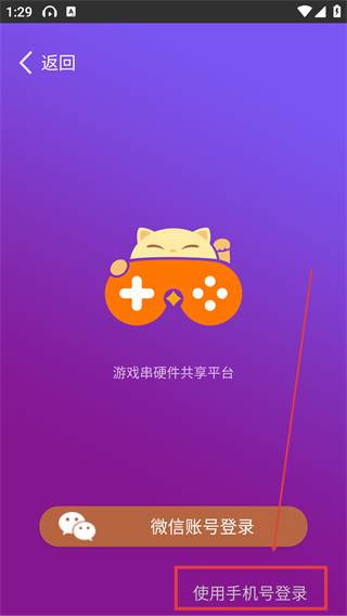 3、【游戏串-硬件共享平台】登录页选红框的【微信账号登录】,也可选择【使用手机号登录】完成登录。
