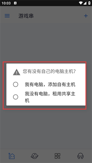 2、【游戏串】界面弹出连接方式弹窗,红框内有【扫主机二维码】等选项,需先安装电脑服务端再选择连接方式。