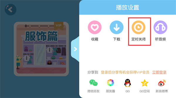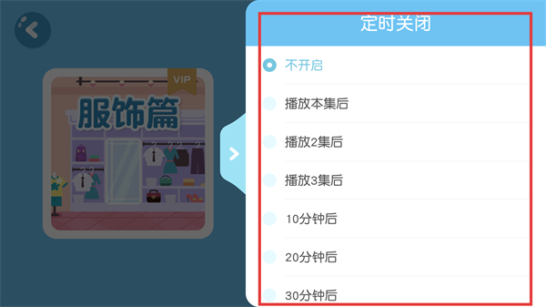 4、【定时关闭】设置页可选择【播放本集后】【10分钟后】等选项,按需设置绘本播放的关闭时长。