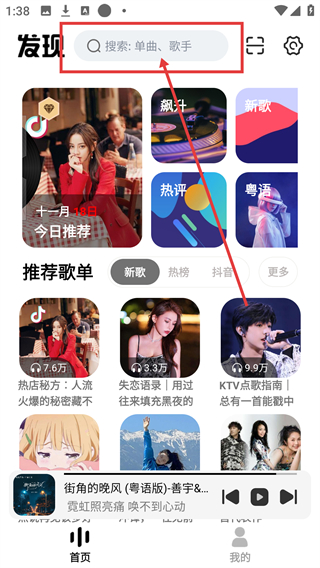 1、在首页,点顶部的【搜索:单曲、歌手】框,可进入搜索界面,查找喜欢的音乐哦。