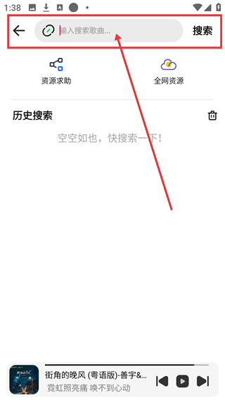 2、进入搜索页后,在输入框填想找的歌曲名,就能开始搜索对应的音乐内容啦。