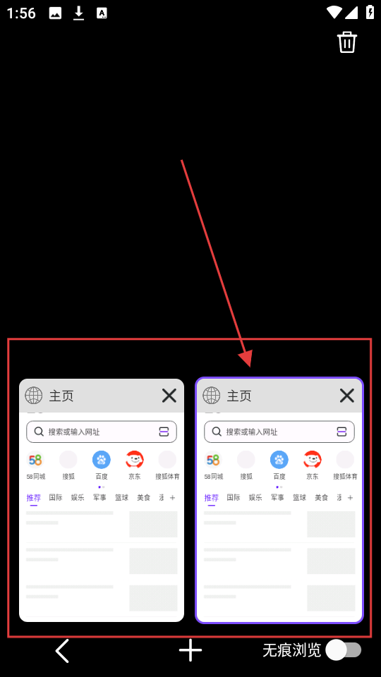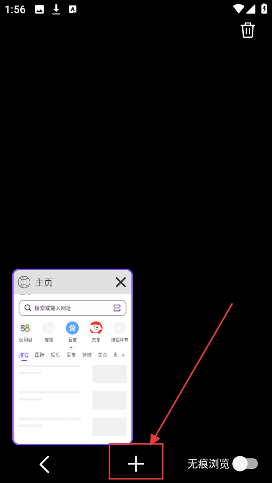 2、在多窗口管理界面点击【+】,就能新建一个窗口,开启多窗口浏览啦。