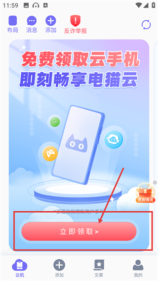 1、在电猫云APP首页点击【立即领取】按钮,就能参与免费领取云手机的活动,开启云机使用啦。