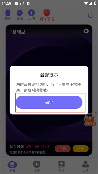 2、若云机即将到期,会弹出温馨提示弹窗,点击【确定】按钮关闭提示后,可进行续费操作哦。