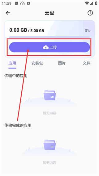 4、进入云盘页面后,点击【上传】按钮,就能选择文件上传到云盘,使用云存储功能啦。