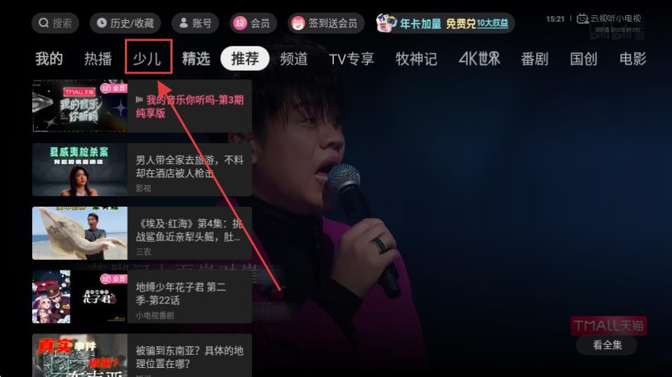 1、我们进入软件,若想进入少儿频道,点击【少儿】,就能进入少儿频道页面啦。