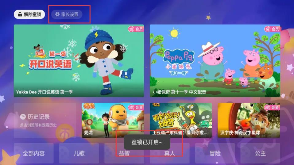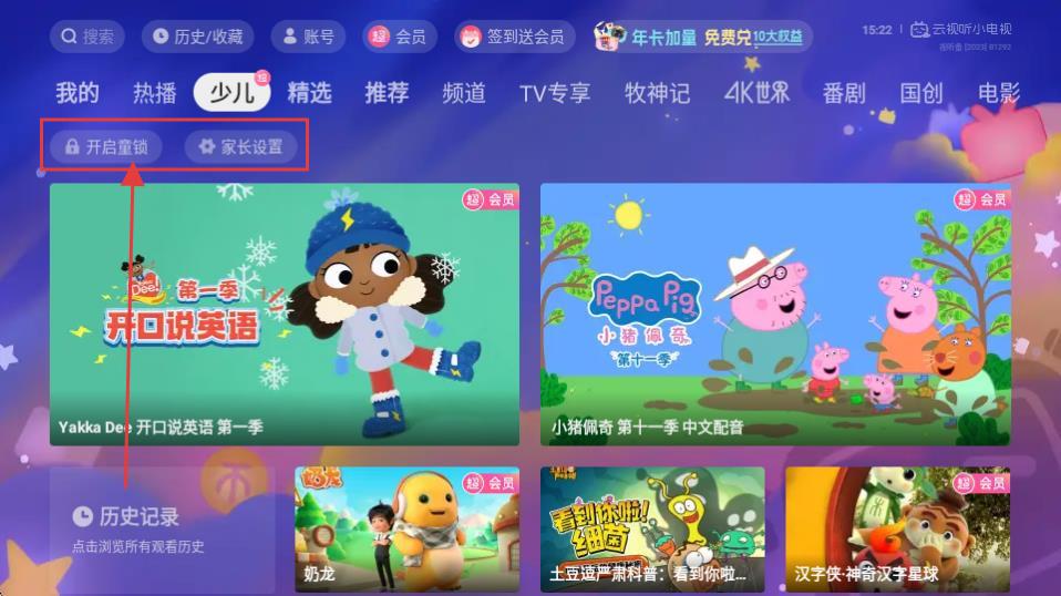2、在少儿频道页面,若想开启童锁,点击【开启童锁】,就能开启童锁功能哦。