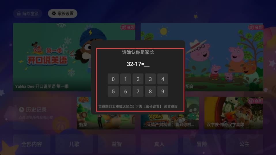 4、进入家长验证环节,需要计算“32-17”的结果,输入正确答案后,就能进行家长设置相关操作啦。