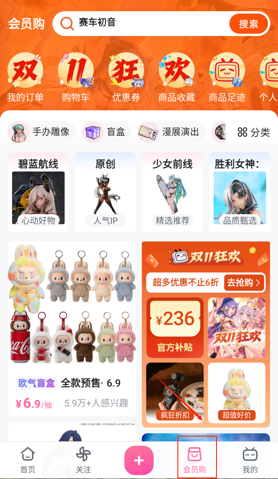 1、在底部导航栏点击会员购进入购物页面,这里有很多动漫周边和正版手办,可以通过分类筛选快速找到想要的商品。