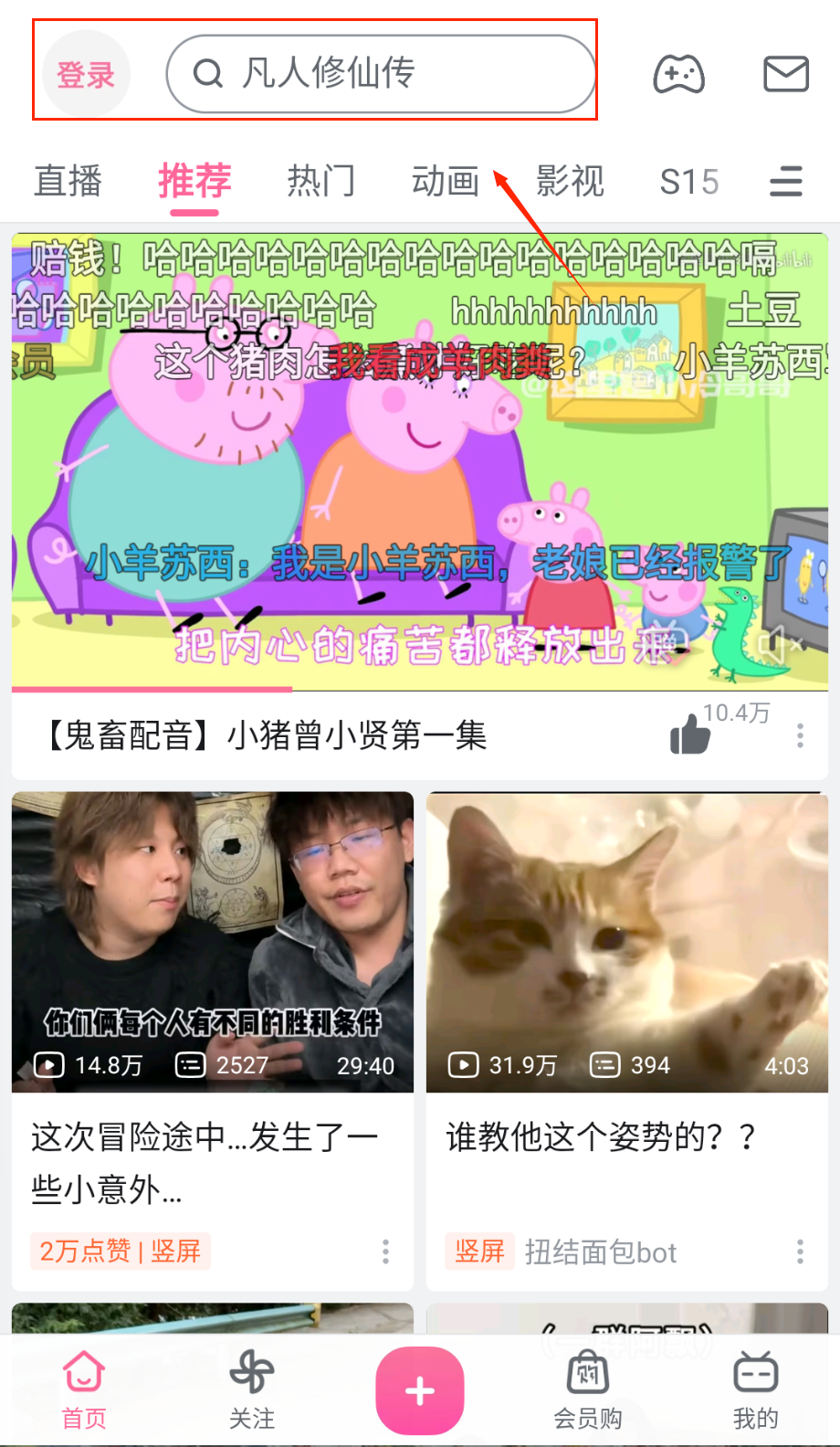 2、在首页推荐页面可以浏览各种类型的视频内容,包括动画、影视、游戏等分类,每个视频卡片会显示标题、播放量和点赞数。