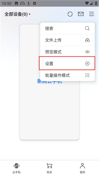 2、在展开的菜单里点击【设置】选项,就能进入云手机设置页面,调整云手机的各项参数哦。