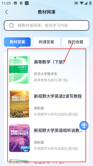 2、进入教材网课页面后,在【教材答案】标签下,选择对应教材(如高等数学-下册),即可查看该教材的内容啦。