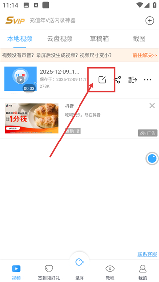 1、在视频管理页找到目标视频,点击编辑按钮就能进入视频剪辑界面,开始处理这个视频啦。