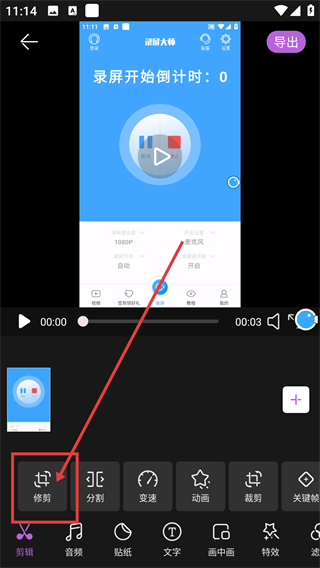 2、进入剪辑界面后,点击底部的【修剪】按钮,就能打开视频修剪的操作面板,调整视频时长啦。