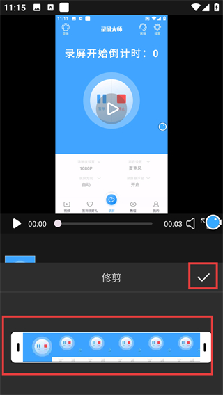 3、打开修剪面板后,拖动时间轴调整视频的起止范围,确认后点右上角对勾就能完成修剪啦。