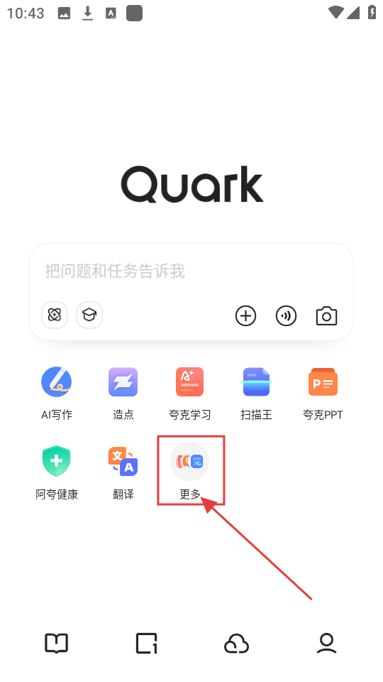 1、打开夸克APP,在主界面找到【更多】选项,点击进入更多功能页面啦。