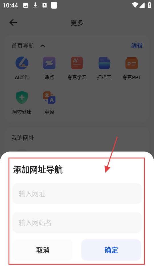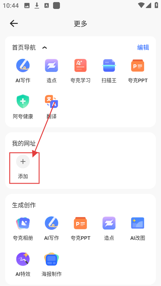 2、在更多功能页面,找到【我的网址】板块,点击【添加】,弹出添加网址导航窗口哦。