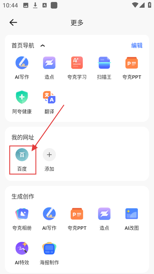 4、添加成功后,在【我的网址】板块就能看到刚添加的网址,比如【百度】,方便后续快速访问啦。