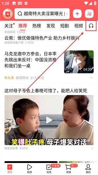 1、在应用的首页,点击右上角的耳机图标,就能进入听内容的专属页面,开启音频类内容的体验啦。