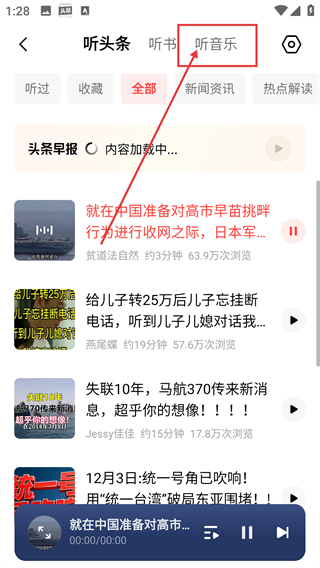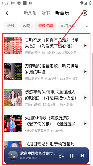 2、进入听内容页面后,点击顶部的【听音乐】标签,就能切换到音乐类音频的内容列表,挑选喜欢的音乐啦。