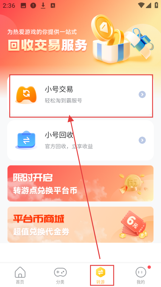 1、打开APP,点击底部【转游】,进入转游页面,找到【小号交易】选项,点击进入交易中心啦。