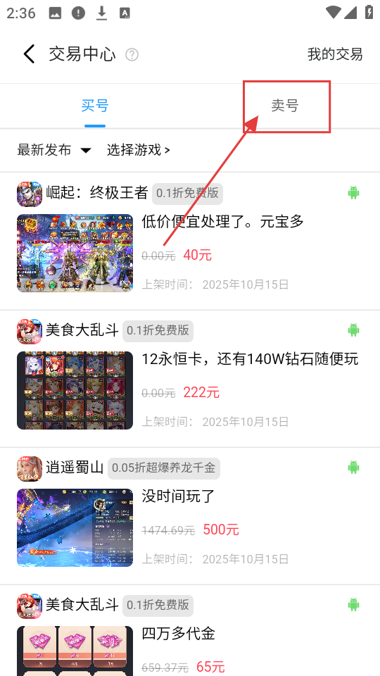 2、在交易中心,切换到【卖号】标签页,可查看卖号相关信息,准备出售自己的游戏小号哦。