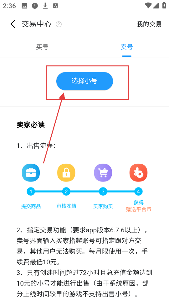 3、在卖号页面,点击【选择小号】,进入小号选择界面,可挑选要出售的游戏小号啦。